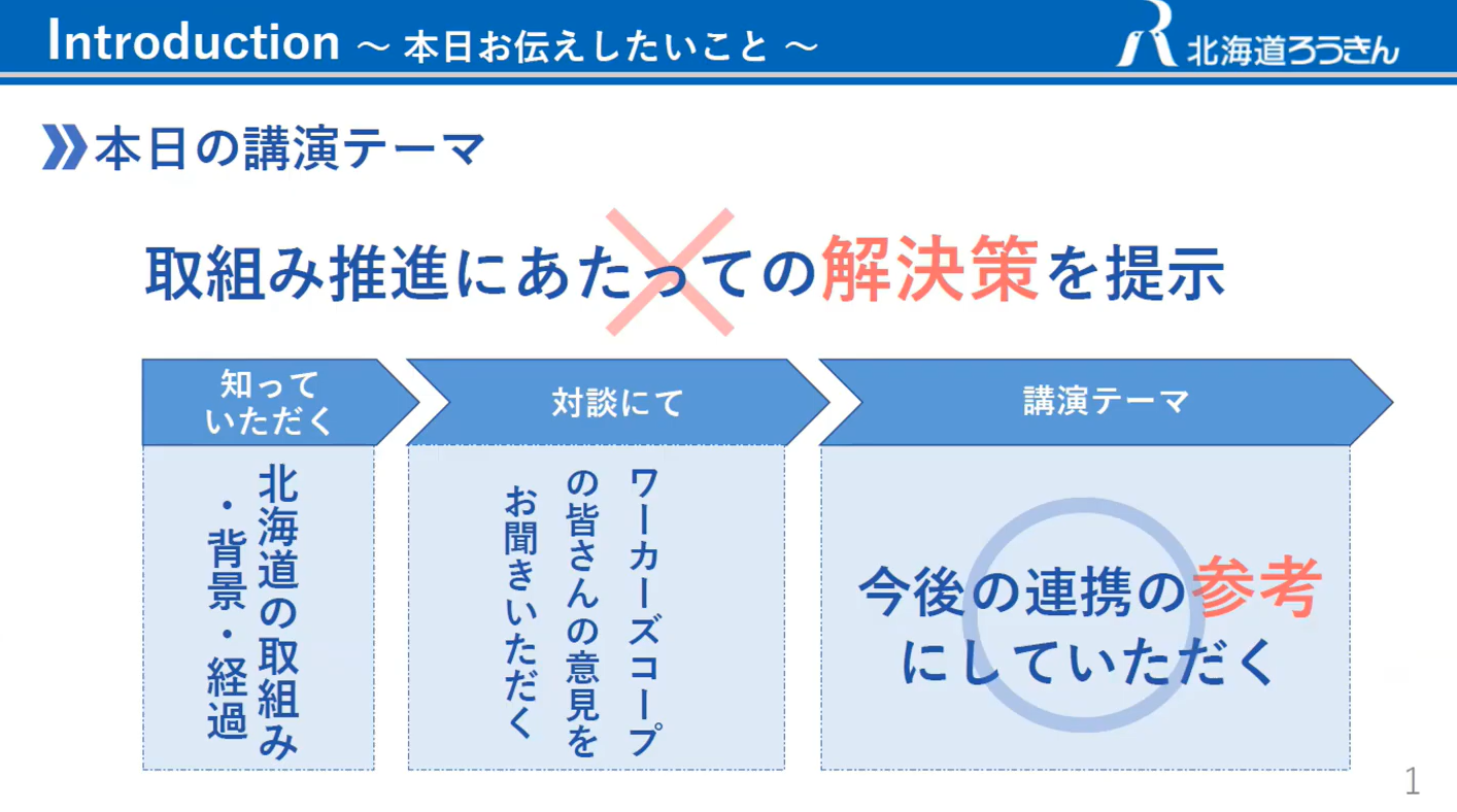講義では、まず、今年2月18日にワーカーズコープと北海道ろうきん間で締結された「相互連携協定」についてご説明いただきました。ワーカーズコープとのフードパントリーの協同開催から始まり、お互いの組織を知ることができるよう緩やかな連携を重ね、継続的な集会への出席や労金連合会の寄付事業を通じた現場支援などの各種取組みを実施することで更なる連携の機運が高まり、協定の締結に至りました。