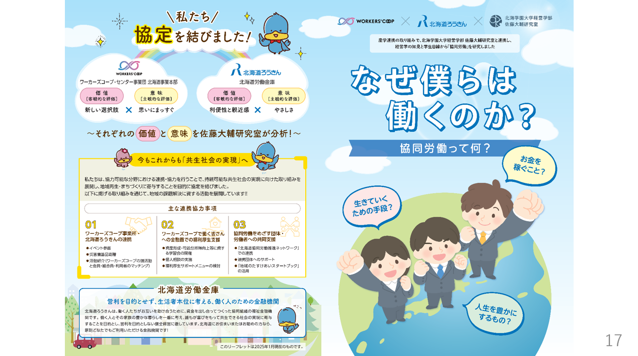 この協定は、持続可能な共生社会の実現に向けた取組みを展開し、地域再生・まちづくりに寄与することを目的としています。協定の締結を契機に、ワーカーズコープと北海道ろうきんの両組織で、イベントの参加や災害備蓄品寄贈、学習会の実施や、地域の"たすけあい"スタートブックの活用といった取組みを通じて連携を深めています。