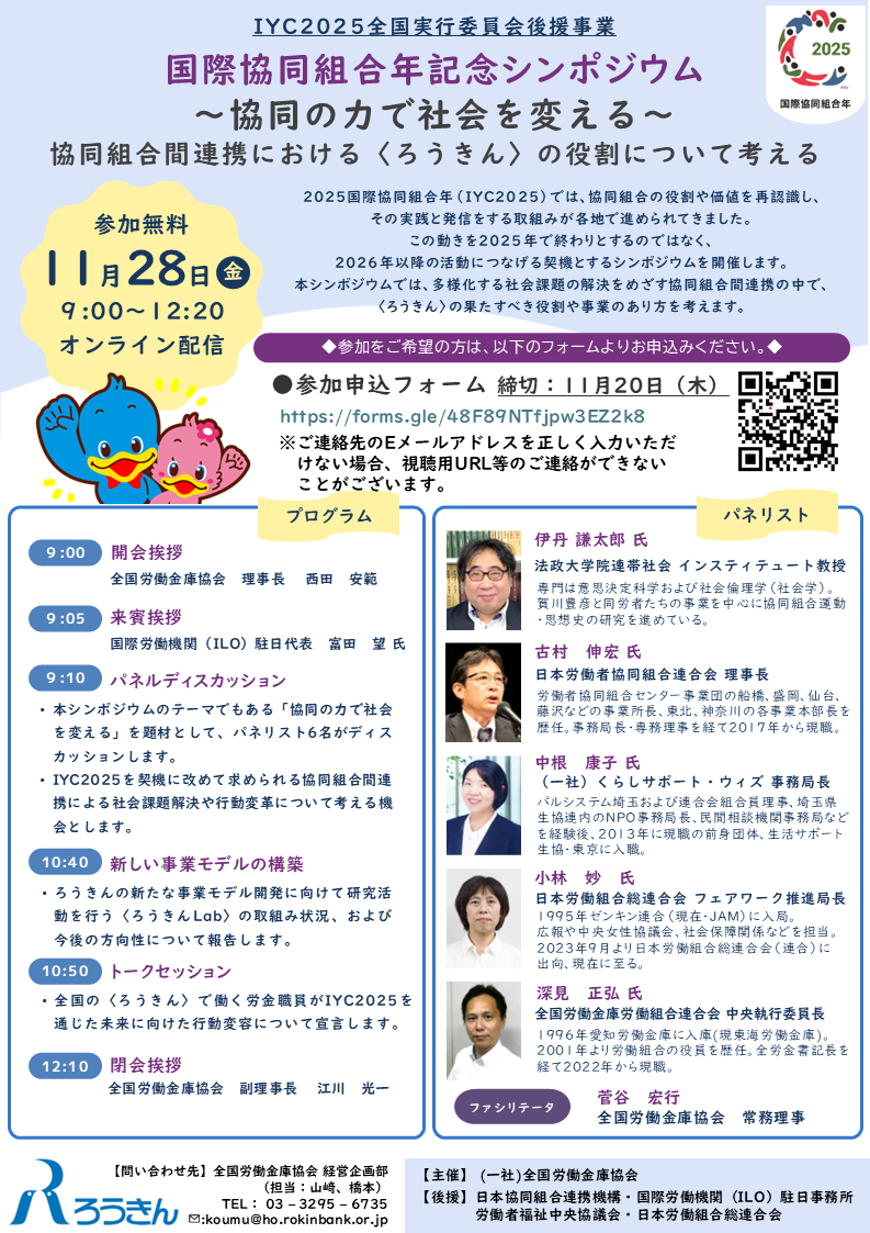 本シンポジウムでは、多様化する社会課題の解決をめざす協同組合間連携の中で、〈ろうきん〉の果たすべき役割や事業のあり方を考えます。