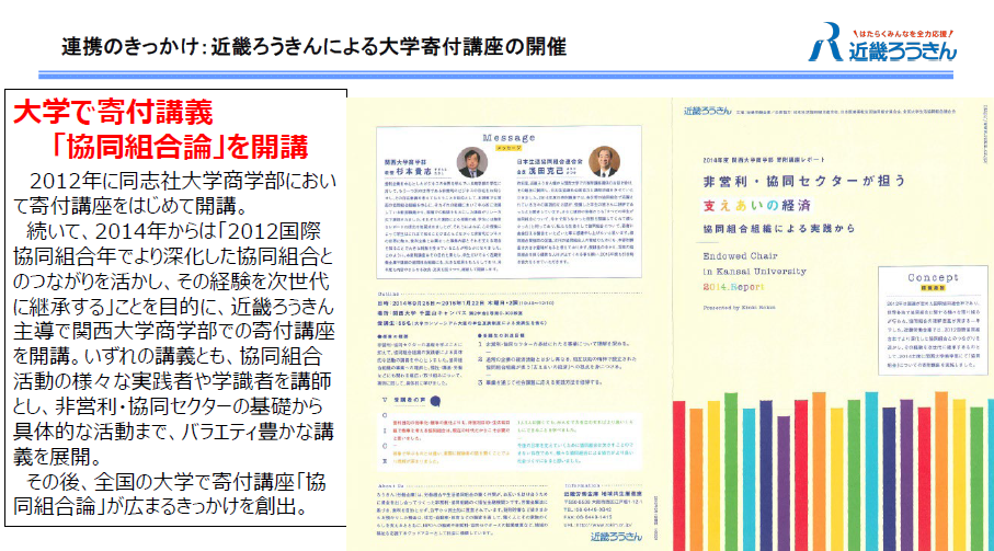 近畿ろうきんの森下氏からは、大学で実施した寄付講座をきっかけに連携が始まった「OCoNoMi(おこのみ)おおさか(大阪府協同組合・非営利協同セクター連絡協議会)」の取組みをご紹介いただきました。OCoNoMiおおさかは、協同組合およびNPO等が相互に連携して共通課題の解決に取り組み、協同組合・非営利協同セクターの活動の促進をはかることを目的に、国際協同組合デー講演会や若手職員合同研修、大学での寄付講座の実施等、さまざまな活動に取り組んでいます。森下氏は、「残りのIYCの時間もフル活用し、同じ助け合いを軸にしている仲間とともに『誰もが安心して生活できる社会』に向けて取組みを進めていく」と表明されていました。