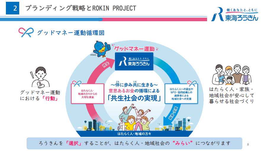 東海ろうきんの山本氏からは、グッドマネー運動を含めたブランディング戦略や、地域共生を強化する活動についてご紹介いただきました。ろうきん内部で理解を深める「インナーブランディング」、その取り組みを多くの人に広げる「アウターブランディング」、そしてこの二つを循環させる「インナー・アウター循環型ブランディング」に取り組んでいます。地域共生に関しては、金融リテラシー学習会やイベント・ブース出展等を通じて、コープや大学生協とのつながりを広げています。このような取組みによって、労金を選択することが、はたらく人・地域社会の"みらい"につながるとお話しされていました。